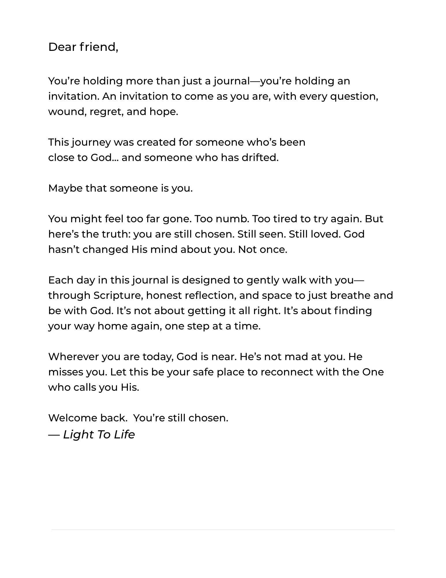 Perfect for anyone longing to rekindle their faith, find comfort in God’s promises, or start each morning with renewed purpose. Whether you’re beginning your faith journey or returning after a difficult season, Still Chosen helps you rediscover hope and intimacy with God.