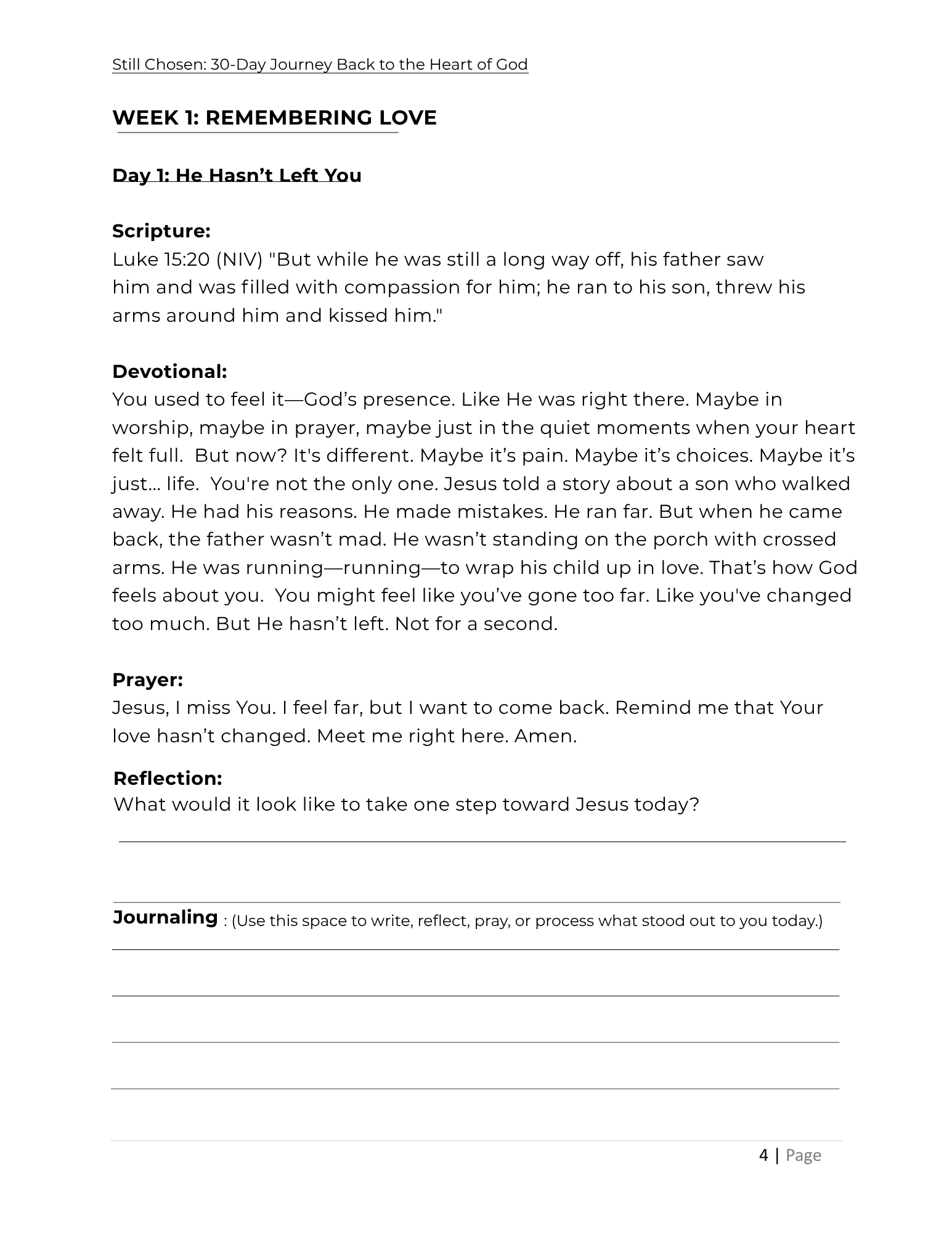 Life’s noise can pull you away from God’s peace, but His call never fades. Still Chosen is a 30-day devotional journey that gently leads you back to the heart of God. Through daily scripture, reflection, and heartfelt prayer prompts, you’ll rediscover your identity in Christ and find renewal in His unchanging love.